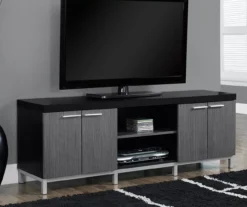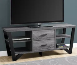 Enhance the look of your living space with the contemporary styling of this Art-Deco inspired TV stand. Constructed with thick panels in an elegant gray woodgrain look top and black finish on all sides and two sturdy round metal legs, this stand features open concept shelving and one drawer ideal for media storage solutions. This console unit accommodates all TV sizes with a center stand and will be a stand out in your living room, family room, den or basement space.