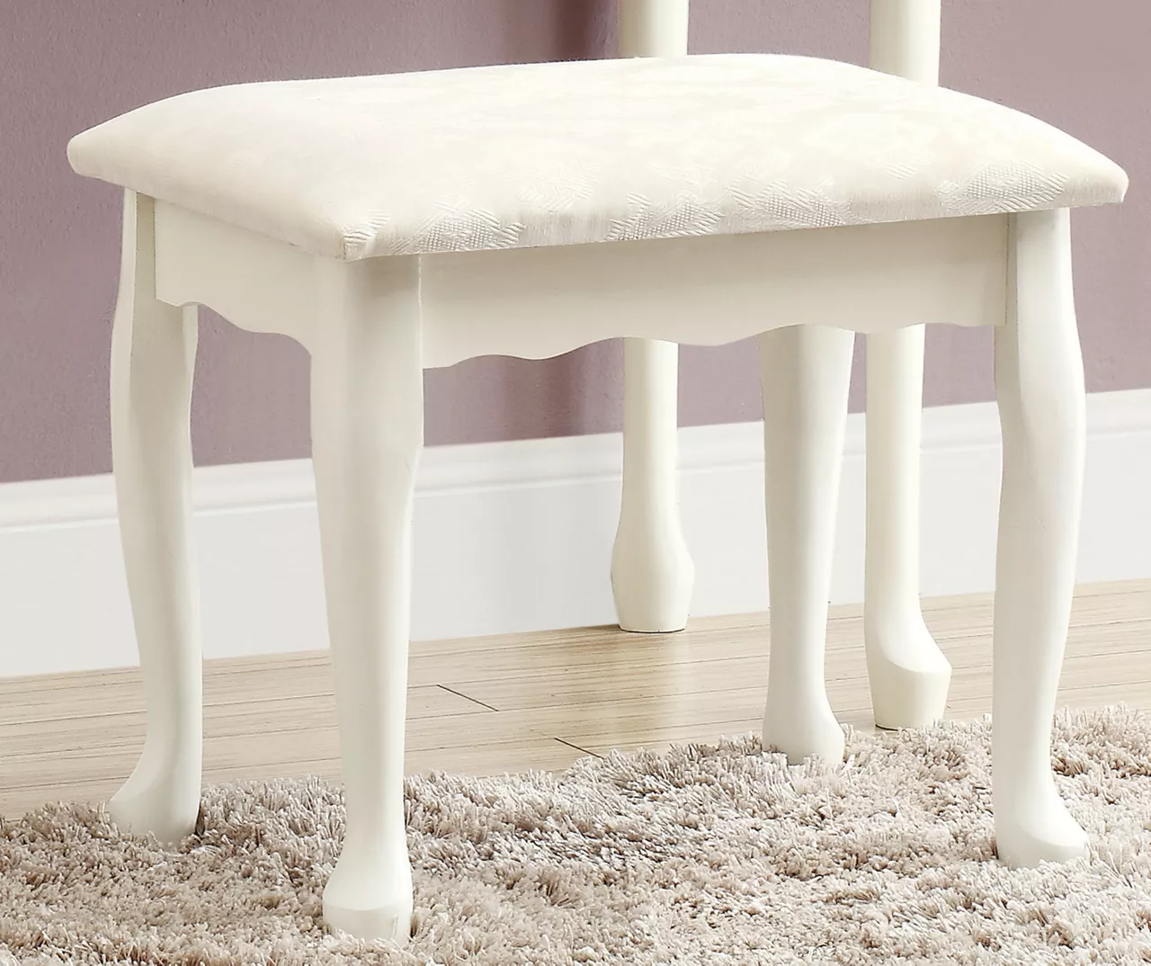 This elegant, two-piece vanity set will be the perfect addition to your traditional master bedroom or dressing area. This vanity set features a dainty apron and cabriole legs in an antique white finish, along with an oval swivel mirror and a storage drawer accented with a simple white wooden knob for keeping brushes and accessories organized. The stool matches with the same elegant cabriole legs with a tone on tone white floral fabric covered seat for a regal look and feel that will add sophistication to any room.