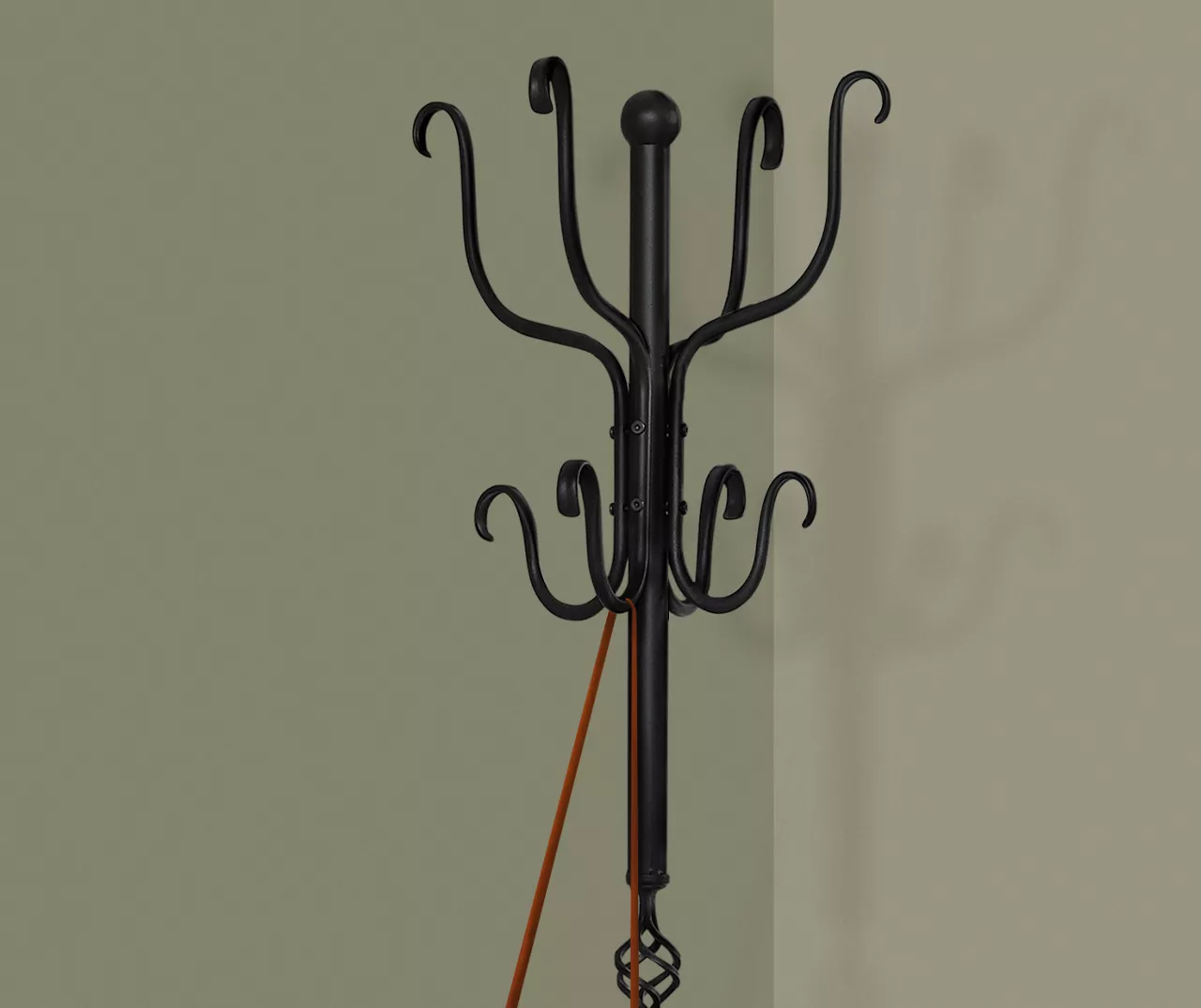 Enhance the look your entryway or hallway with this elegant traditional hammered black metal coat rack. A lovely accent piece on its own, this piece will help to keep you organized in style. The eight hanging hooks allow you to keep everyday items like coats, hats and jackets neatly in place while the classic appeal is reminiscent of a romantic Parisian apartment that will provide you with years of lasting enjoyment.