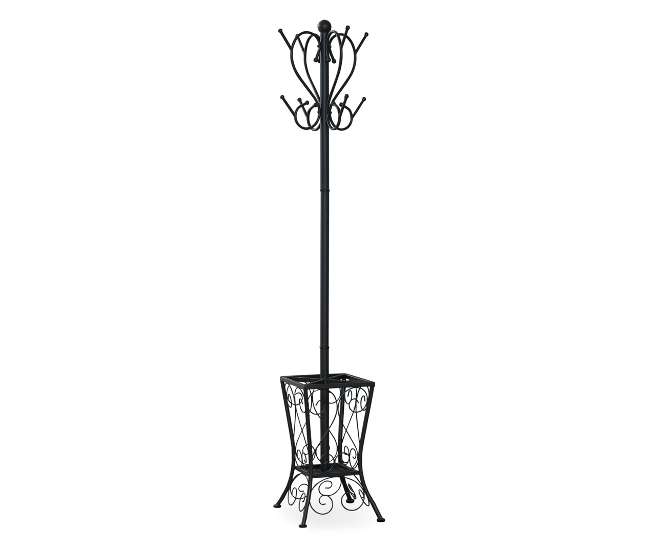 Enhance the look of your entryway or hallway with this black metal coat rack and umbrella stand. The two tiers with a total of eight curved hooks paired with an elaborately scrolled basket offers the perfect place to store hats, jackets, scarves and umbrellas. The classic appeal of this coat rack lends itself to a stylish elegance reminiscent of a romantic Parisian apartment that will provide you with years of lasting enjoyment.