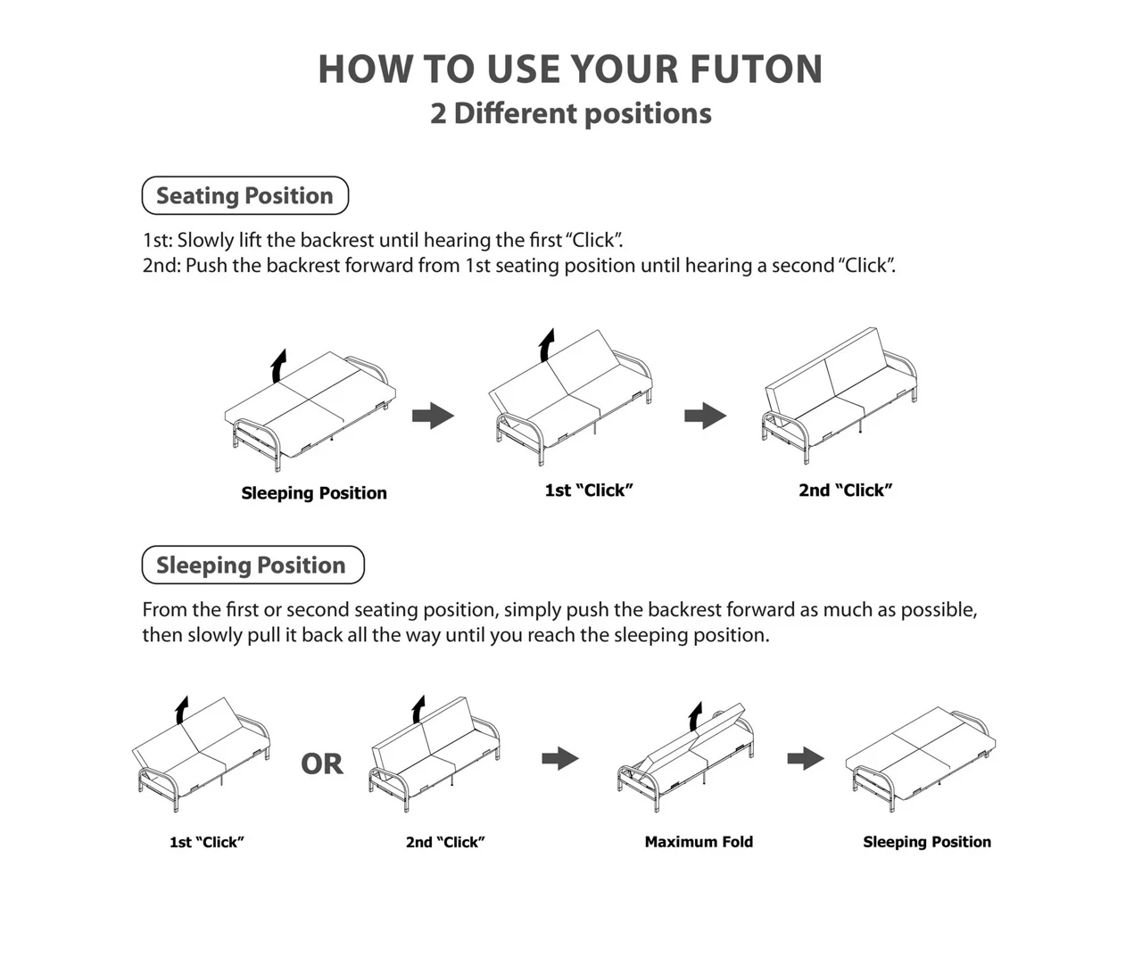 - Click and lock system allows sitting to lounging and sleeping positions with a simple push or pull of the backrest