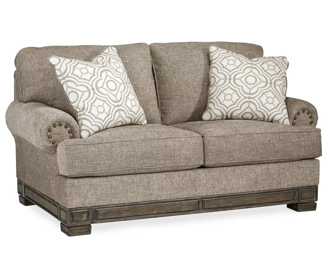 This standout loveseat from Ashley invites you to bring home a richly substantial look at a remarkably comfortable price. Cool, classic elements include flared roll arms punctuated with nailhead trim and a chenille-feel fabric with loads of chunky texture. Gently distressed finish on the exposed rail infuses a relaxed sensibility that feels like home in your living or family room.