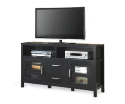 - Stand holds TVs up to 65″ wide and 120 lbs.