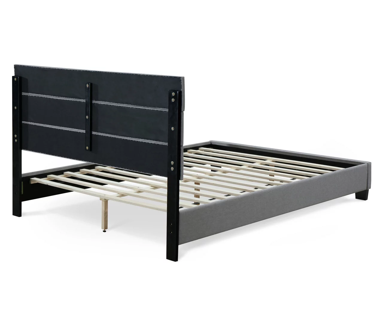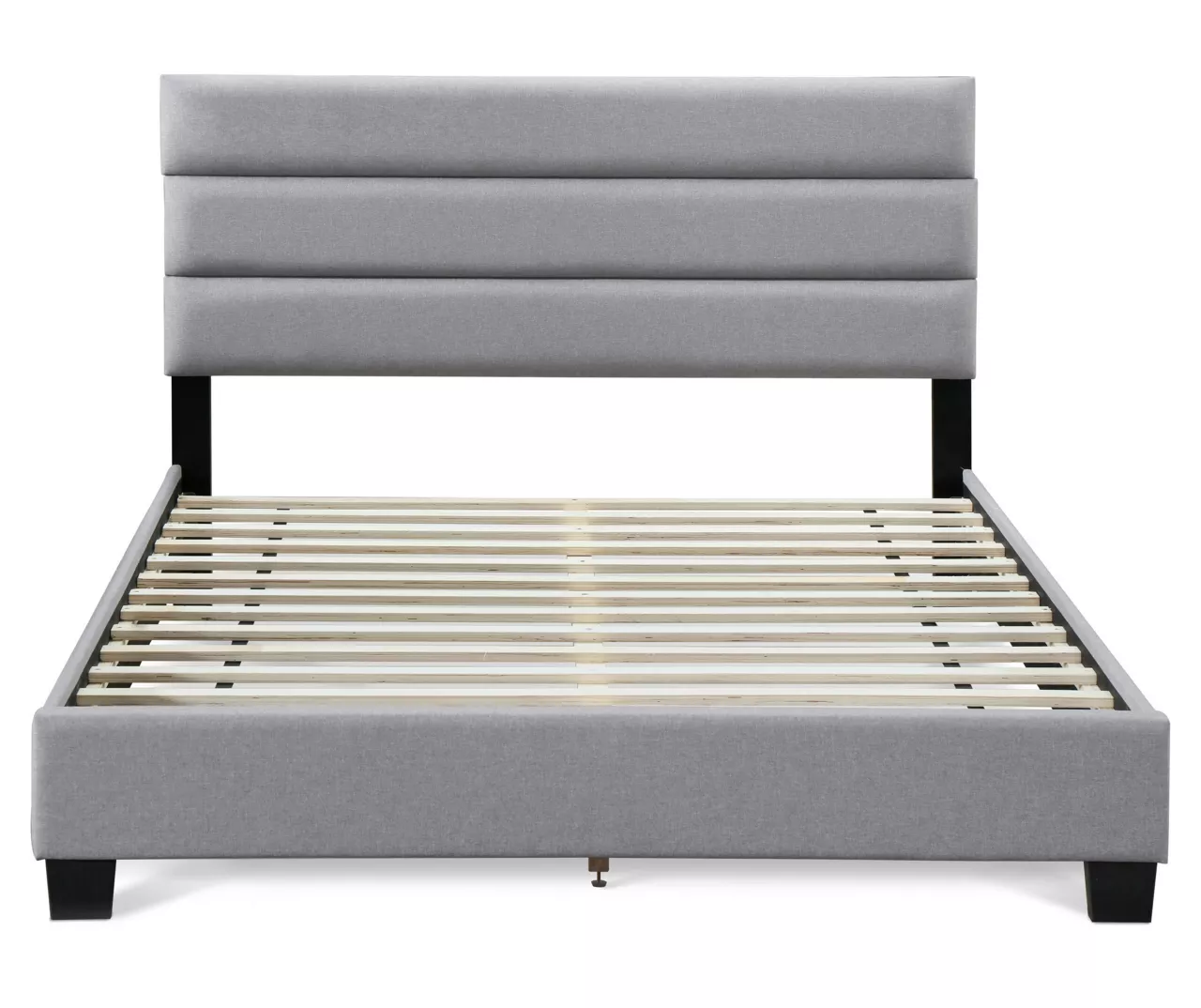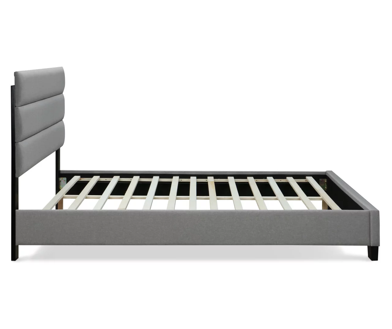 For a stunning focal point in your bedroom’s modern decor, this queen-size bed frame is upholstered in a smooth linen-like fabric. The unique padded channel tufting adds a clean, tailored touch to your bed linens. This bed is ideal for those who prefer a low profile bedroom set with the included slat kit, so a box spring is not required for mattress support.