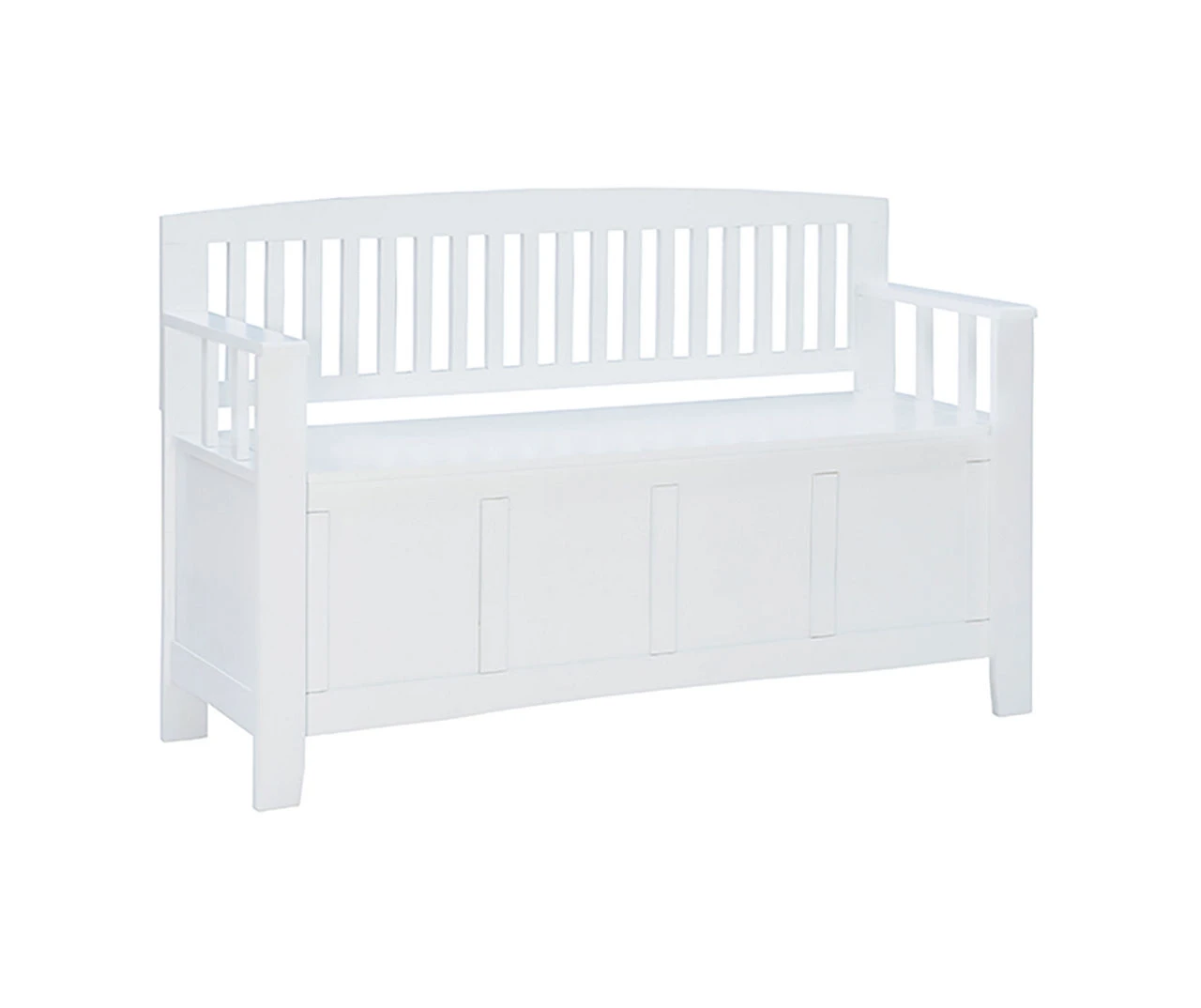Create added seating and storage to your entryway, mudroom, bedroom or living room with this attractive and sturdy storage bench. The bench features a flip top lid with no-slam hardware, allowing for easy access to items you want out of sight. The slat designed back and armrest are finished in a glossy white paint allowing it to be used with virtually any decor. Add a colorful seat cushion or your favorite accent pillows to brighten up the room.