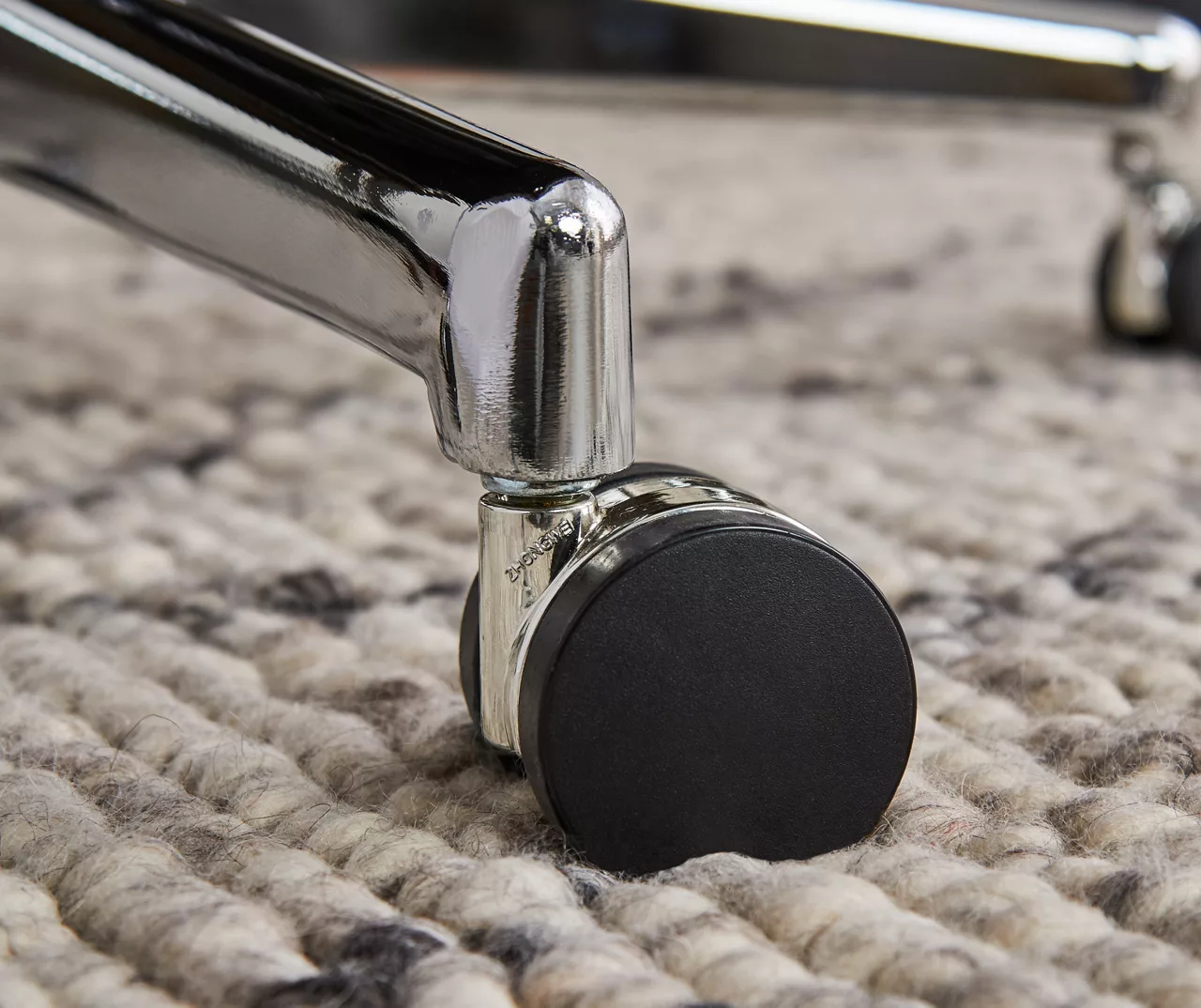 Say hello to your new favorite work colleague, the Leighton desk chair. You’ll sink into its soft memory foam cushions and never go back to any other office chair again. Its silhouette descends graceful arms from its barrel back to embrace a comfortably cushioned seat that’s accented with nail head trim. And if you’re always on the move, the durable rolling casters are suited for any floor type. A combination of handsome bonded leather and crisp chrome detailing, this desk chair easily transitions between traditional and modern decor.