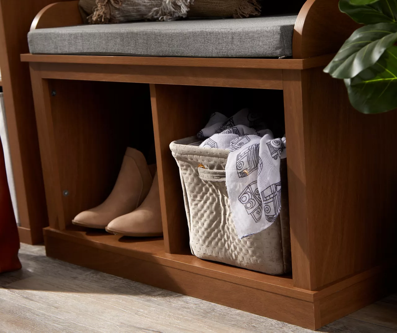 - Gray cushioned seating allows you to easily put on or take off shoes
